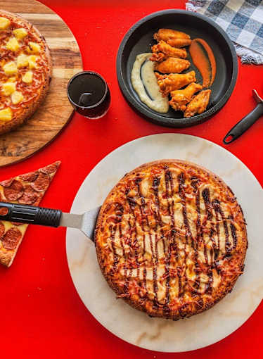 A hefty helping of satay sauce on the base followed up with fresh roast chicken breast, premium pineapple, finished off with big chunks of middle rasher bacon and mozzarella.